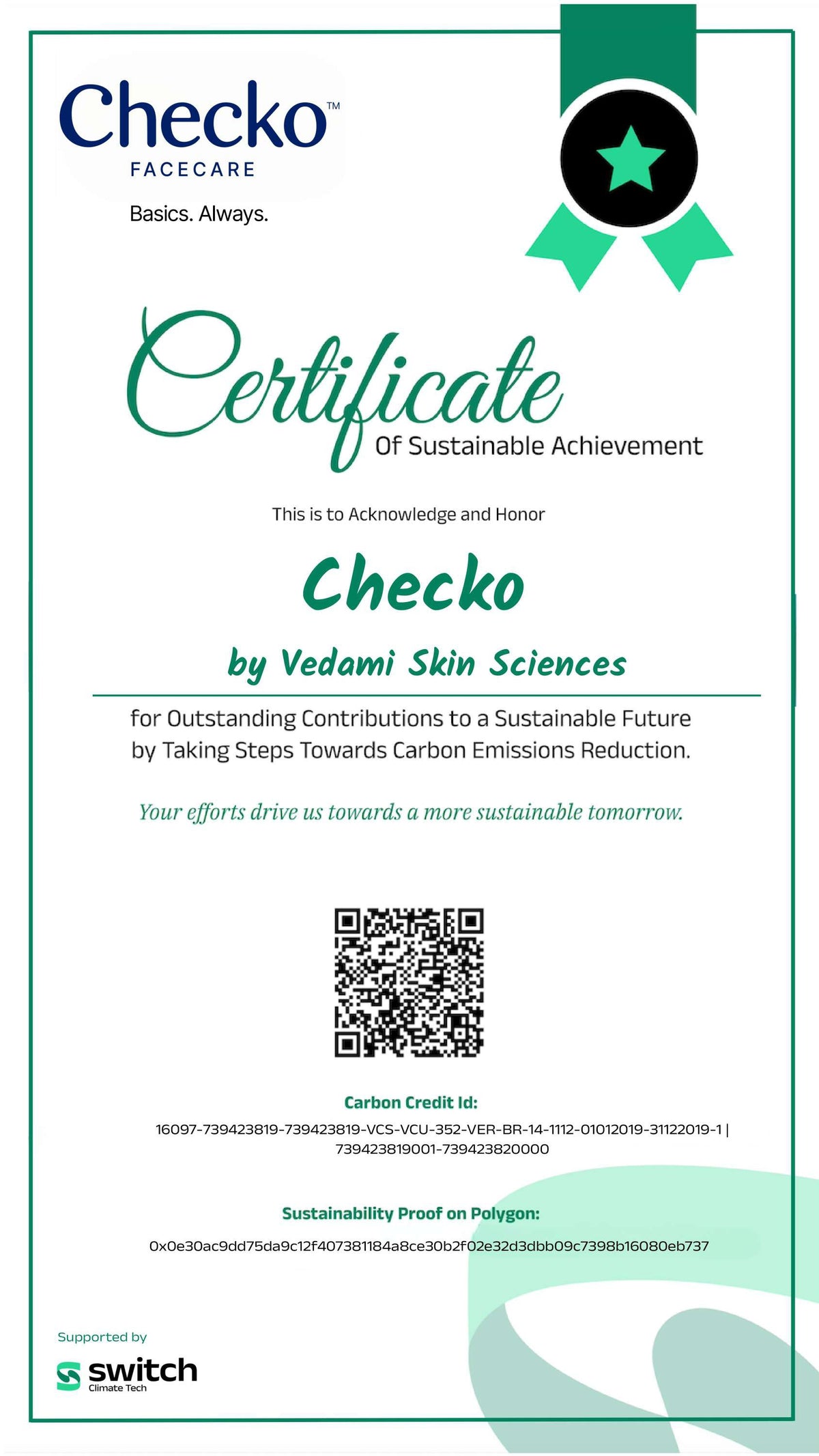 Every Checko product is a quiet promise- to care for your skin while caring for the Earth. We believe sustainability should feel honest, not overwhelming. That's why we've partnered with Switch Climate Tech, our trusted guide in climate responsibility. With shared values of transparency and truth, we're walking the path toward a more thoughtful, planet-friendly skin-care experience.